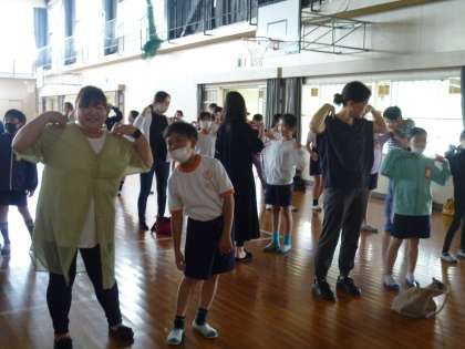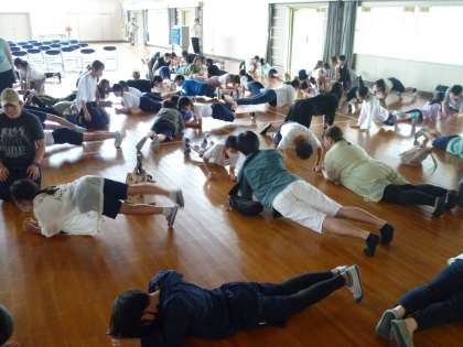 発表の後、けが防止体操である「くの字体操」「Sの字体操」「とかげジャンケン」「カニカニ体操」を、親子で行いました。保護者も100人ほどご参加いただき、けがをしない体づくりを学ぶことができました。
