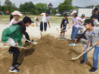 6/27に、6年生は運動場の整備を行いました。前日の修復作業で余った土を、運動場のへこんでいる所にまきました。自分たちが使う運動場を、丁寧に整備しました。