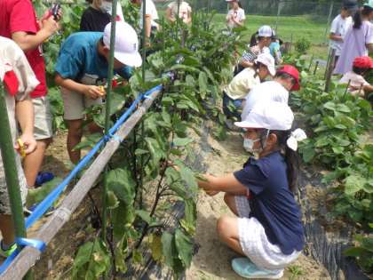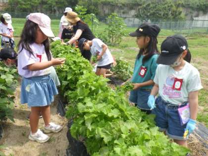 1・2年生は、毎日野菜の水やりをして、お世話をしています。6/27も、みんなで畑にでかけ、収穫を行いました。曲がったきゅうりを見つけて、大喜びしていました。