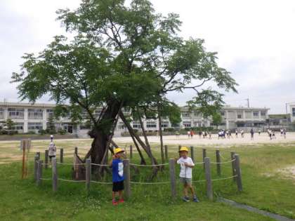 伊保小のシンボルツリー「せんだんの木」は、樹齢およそ120年です。運動の西側にどっしりと根をはり、子どもたちを見守っています。