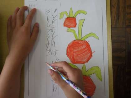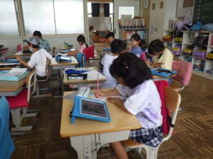 6/27の2年生の生活科では、野菜の観察を行いました。学習用タブレットを持って畑に行き、野菜の写真を撮りました。今回は、下から上まで全部入るように気をつけながら写真を撮りました。教室に帰って、観察ノートに観察記録を書きました。