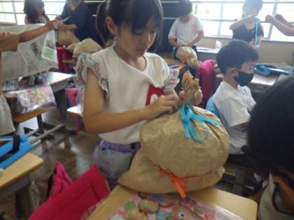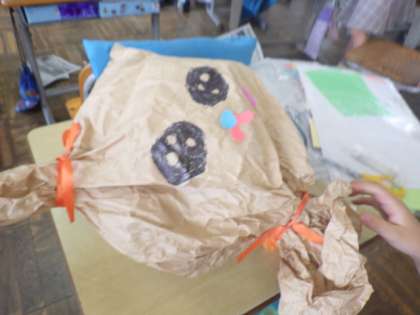 2年生の図工では、「くしゃくしゃぎゅっ」という作品を作っています。これは、紙袋にくしゃくしゃに丸めた新聞をつめて立体をつくり、そこに飾りをつけるものです。