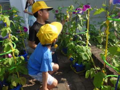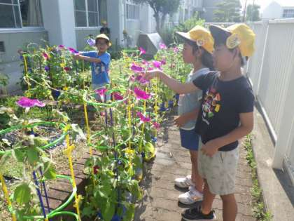 1年生が育てているアサガオが、次々に咲いています。「みてみて、5つもさいたよ!」と嬉しそうです。