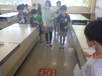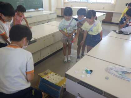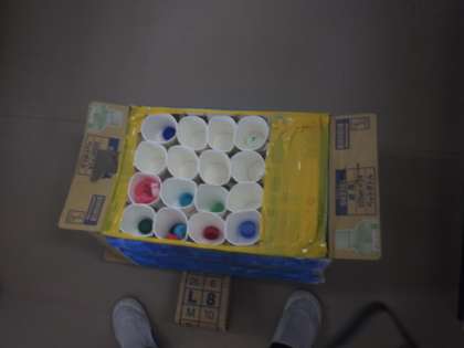いぼリンピック「キャップでBINGO」の会場では、児童手作りの的に向かって、参加児童がペットボトルのキャップを投げ込んでいました。より高い点を狙って、慎重に投げ込んでいました。