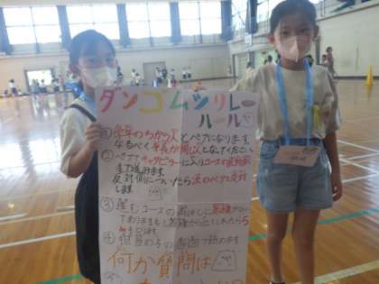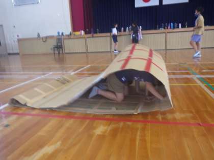 いぼリンピック「ダンゴムシリレー」の会場では、児童手作りのキャタピラの中に複数の児童が入り、リレーを行っていました。を探すゲームを行っていました。