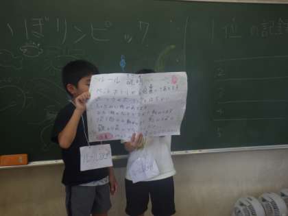 いぼリンピック「しょうがい物ボーリング」の会場では、ペットボトルで作ったボーリングのピンをめがけて、参加児童が黄色い液体の入ったペットボトルを投げて、ピンを倒していました。
