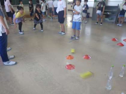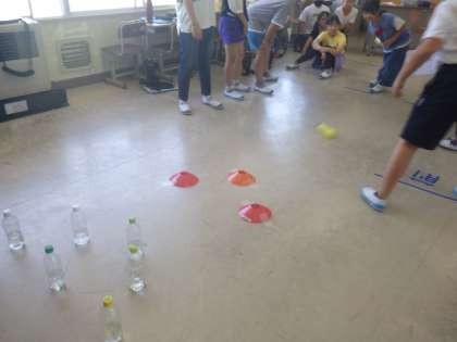 ピンの前に、いくつかしょうがい物がつくってあり、なかなかピンに当たらないようになっていました。参加児童は、力いっぱいペットボトルを投げて、ピンが倒れると大喜びしていました。