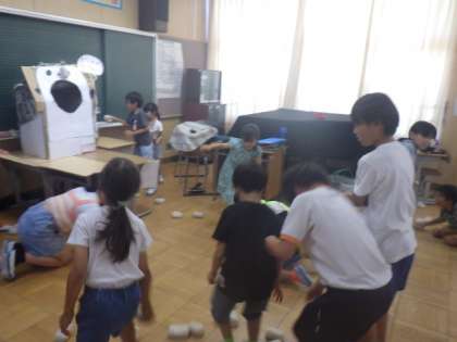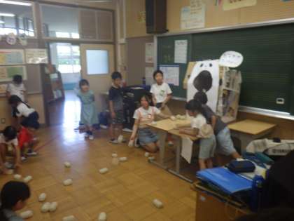 ゲームに参加する児童は二手に分かれ、玉入れ用の玉を、一斉に投げ込んでいまいた。