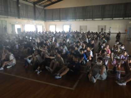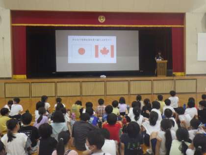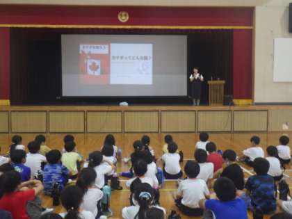 7/10は、以前カナダで働いた経験のある保護者を講師に招き、全校でカナダについて学習をしました。カナダの気候・自然環境や文化について勉強をしました。カナダに生息するビーバー、シャチ、ムースなどの写真がスクリーンに映ると、児童は大喜びをしました。