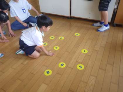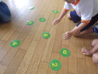 7/12(水)の長い休み時間には、1階、2階のワークスペースに希望者が集まり、「ナンバータッチ」を行いました。床に置かれた1〜10までのカードを、順番にどれだけ速くタッチできるかを競うものです。