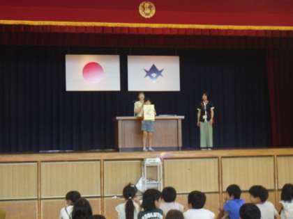 表彰伝達では、地域の剣道クラブでがんばっている児童の表彰がありました。また、生徒指導担当教師から、「夏休み中は、安全に気を付けて過ごし、また、全員で9月に会いましょう」という話がありました。