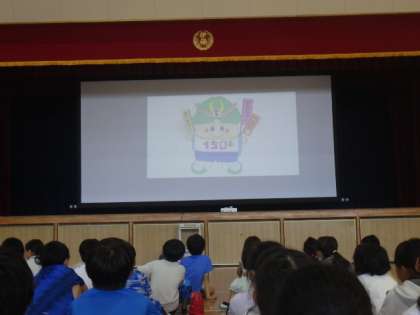 6年生からは、「伊保小学校のマスコットキャラクター『いぼりん』」の発表があり、全校児童は大喜びでした。いぼりんをデザインした6年生児童からは、いぼりんに込められた思いの発表がありました。いぼりんは、「せんだんの木」をモチーフに、頭には校章がついており、「あいさつ、返事、感謝」という児童が大切にしている3つの言葉を背負っている、かわいらしいマスコットです。説明を聞いて、児童はとてもうれしそうでした。