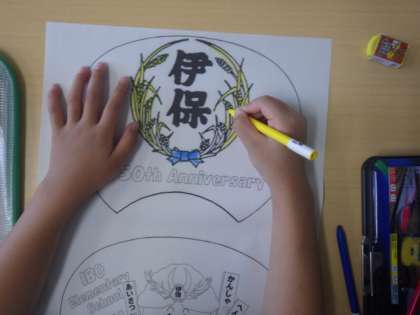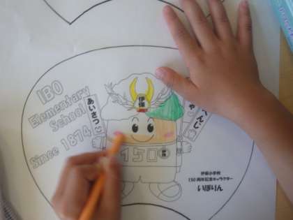 伊保小学校のマスコットキャラクター「いぼりん」を、1年生は生活科の時間に色塗りをしました。今後、これをうちわに貼って、いぼりんうちわにします。1年生は「いぼりん、かわいい。いぼりんだいすき」と、言っていました。