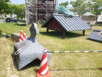 平成9年に豊田市の「シンボル施設設置事業」で建てられた「ふれあいの塔」が、老朽化したため、撤去工事が始まりました。塔の屋根の部分が取り外され、地面に置かれています。