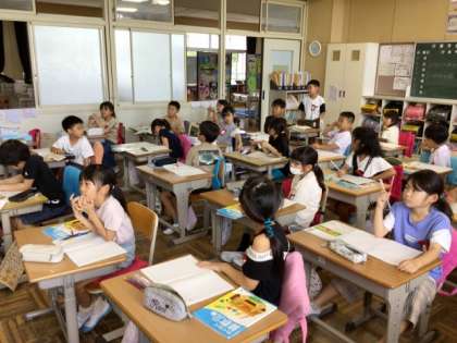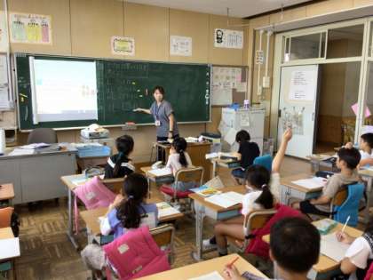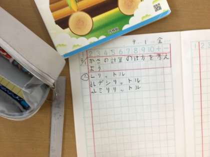 2年生の算数では、「かさの計算」を学習しています。9/1の授業では、夏休み前に学習したことを復習していました。「1リットルは何デシリットルだったっけ?」と教師が質問すると、一斉に手が挙がりました。