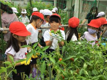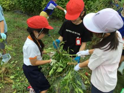 2年生は、9/21に野菜畑をきれいにしました。4月末から大切に育ててきた夏野菜の実を最後に摘み取り、野菜の株を抜いてきれいにしました。「今まで、おいしい野菜をありがとうね」と、お礼を言いながらきれいにしました。