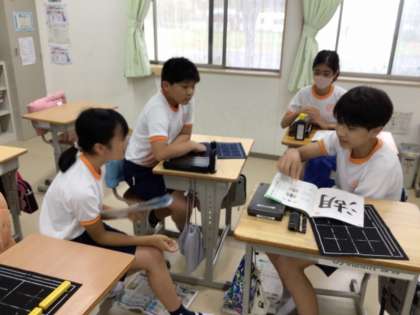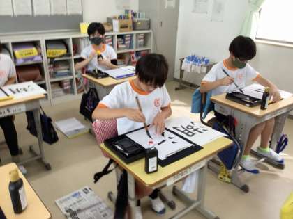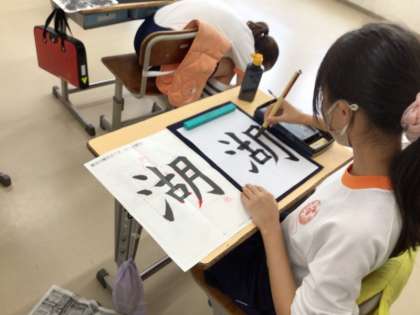 6年生の書写では、「三つの部分からなる漢字をバランスよく書く」ことを目標にして勉強しました。最初に「働」という字をよく見て、バランスよく書く方法を児童は話し合いました。「『イ』『重』『力』を、それぞれ細く書く」「『重』と『力』を上下にずらす」など、バランスよく見える方法について考え、発表しました。見つけたことに注意して、「湖」という字を、三つの部分のバランスに気をつけながら書きました。