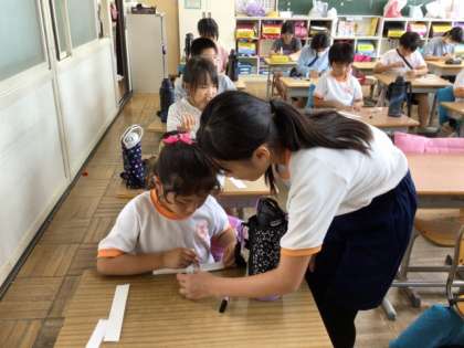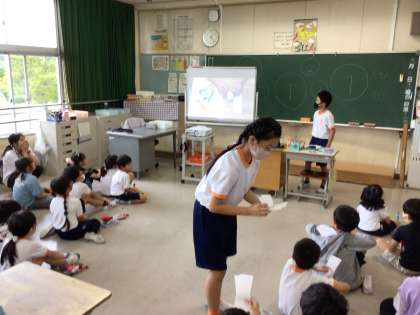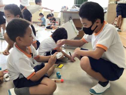 9/21のフレンド遊びは、連日の猛暑のため室内でできる「ものづくり」を6年生が計画しました。昼休みに各フレンド班は各教室に分かれ、「エックス・ジャイロ」を作りました。6年生は作り方を紹介した動画を作り、それを見せながら全学年の児童で作りました。エックスジャイロとは、紙を筒状にしたものです。児童はできるあがると、教室で飛ばして楽しみました。