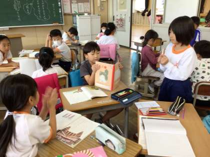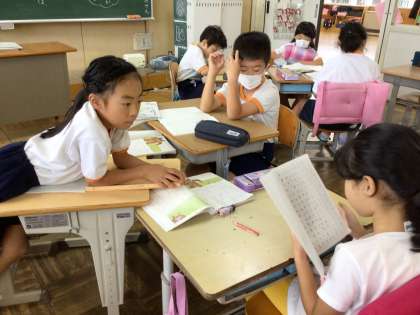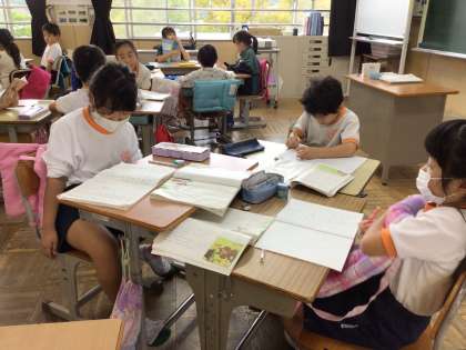 2年生の国語では、「ニャーゴ」を学習しています。10/4の授業では、ニャーゴのお話の振り返りを書きました。印象に残った場面を選び、それについての感想を書きました。書き終わったら、班の中でミニ発表会をしました。