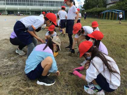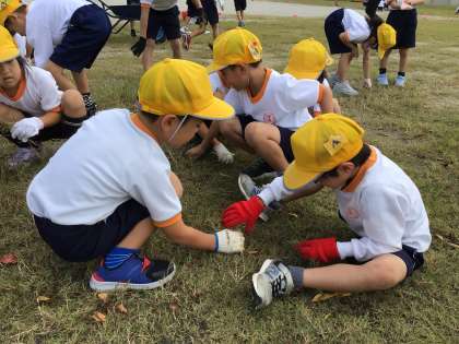 10/11(水)の清掃時間に、福祉美化委員が計画した「草取り大作戦」を行い、1・3・5年生が運動場の草取りを行いました。