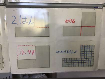 授業では、L字型の図形の面積の求め方を考えました。L字型の図形に補助線を入れて分割して考えたり、大きな長方形にして、あとから余分な部分を引いたりと、班ごとに工夫して求めていました。