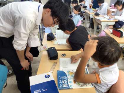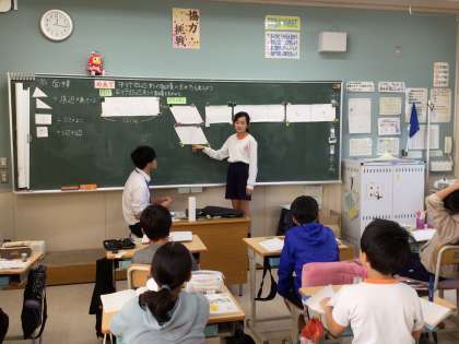 5年生には、教育実習生が入り、児童に勉強を教えたり、一緒に遊んだりして、3週間生活しています。10/13金は、教育実習生が算数の研究授業を行いました。