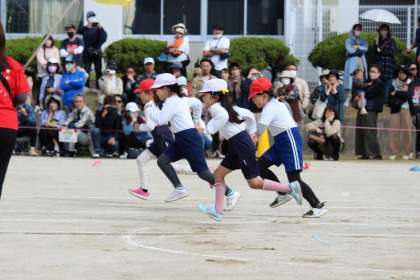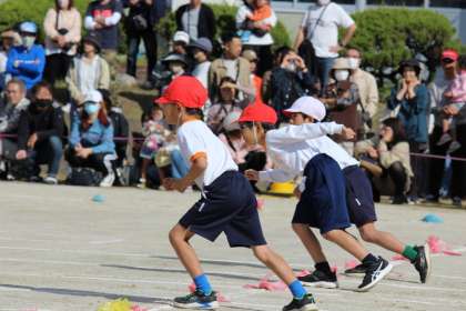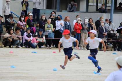 プログラム1番は、低学年による徒競走。自分のために、チームのために、力いっぱい走りました。