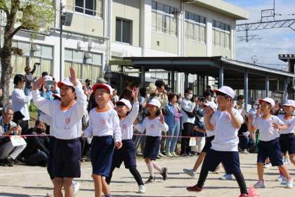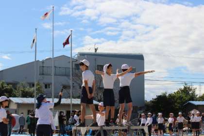 プログラムの最後は、全校児童での「おいでん踊り」。運動場中央の指令台に、6年生代表児童が立ち、大きな掛け声と合言葉「IBO」をかけて、始まりました。