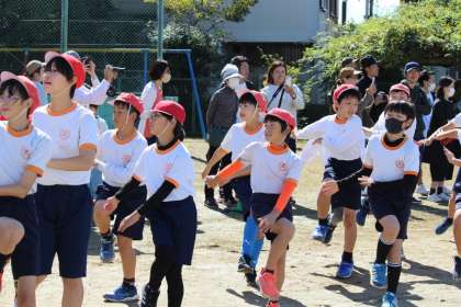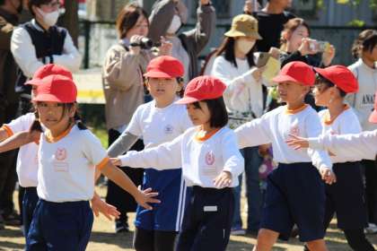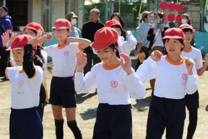 大谷高校ダンス部のみなさんに教わったおいでん踊りを、全校児童で楽しく踊りました。