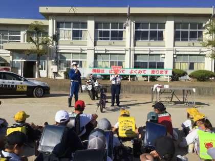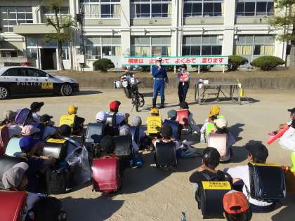 10/26(木)一斉下校時に、豊田警察署交通係の警察官2名が来校し、全校児童を対象に交通安全教室を行いました。