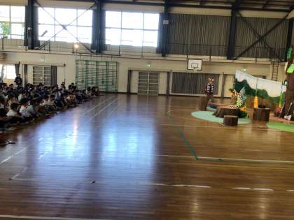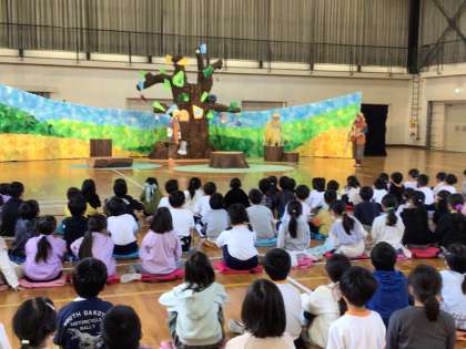 本校では昨年度もうりんこさんに来ていただいたため、楽しみに待っていた児童が多く、会場の児童全員で「うりんこさ〜ん」と呼び掛けて、劇がスタートしました。