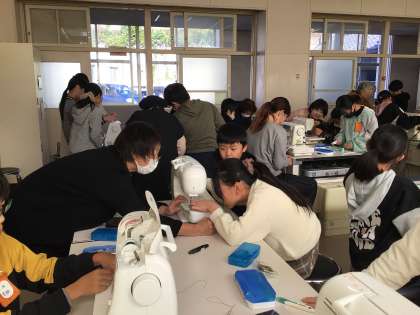 11/13の授業では、地域のミシンボランティアの皆さんが各班に一人ずつついてくださり、丁寧に教わりながらエプロンづくりを進めました。