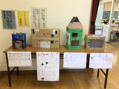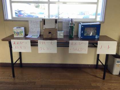 児童は、鉛筆や消しゴム、ノートなどの回収箱を作り、学校内に設置しました。4年生児童は、毎日、回収箱の文房具を回収しています。