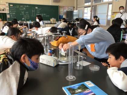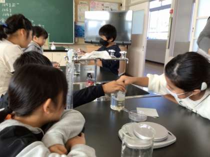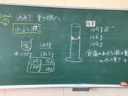 5年生の理科では、「もののとけかた」を学習しています。11/22の授業では、100gの水に5gの食塩を溶かすと、重さはどう変わるかを考えました。「100gのまま」「105gになる」という2つの意見が出て、児童は実験をしました。食塩水をはかりに乗せると「やっぱり105gなんだ!」と、感嘆の声をあげました。