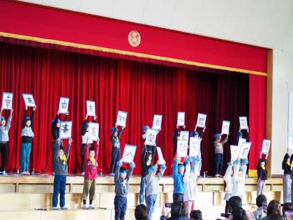 プログラム1番は、3年生「It's show(書)time !」。3年生で習い始めた習字やリコーダーを披露しました。児童は、自分の好きな漢字を毛筆で書いて披露し、大きな拍手をもらいました。