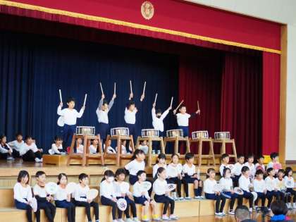 プログラム2番は、2年生「いぼっ子祭りだ!」。2年生児童が作ったリズムを、締め太鼓で演奏しました。5〜6人のグループでリズムを合わせて太鼓をたたく姿が、とても恰好よかったです。