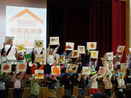 プログラム3番は、1年生の「おはなしのせかいへ ようこそ 〜からすのパンやさん〜」。絵本「からすのパンやさん」を演じました。一人一人のせりふと、声を合わせる群読を披露しました。児童がそれぞれ描いたオリジナルのパンの絵が、素敵でした。