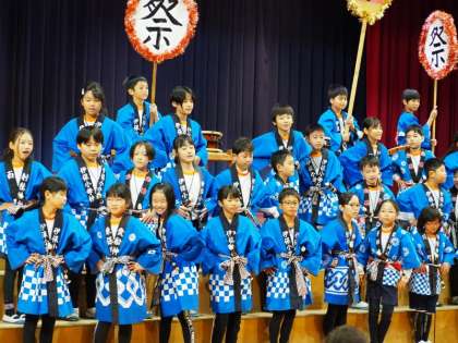 プログラム4番は、4年生の「祭りだ!わっしょい!」。和太鼓の音に合わせて、「お祭り」(北原白秋)を群読しました。太鼓と掛け声、踏み出した足の音が、とても威勢がよく、体育館が夏祭り会場となりました。