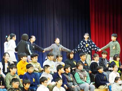 プログラム5番は、5年生「キャンプで見つけた4つの心」。5年生最大の行事を通して見つけた、大切にしたい4つの心について、発表しました。暗くなった舞台で、鮮やかに光るトーチ棒を回したり、キャンプで歌った歌を披露しました。キャンプでの楽しい風景が、よみがえりました。