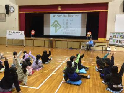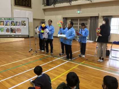 2年生での人権移動教室では、いじめに関するDVDを視聴後、児童が感想を発表しました。「最後に(登場人物)みんなが助け合っていてよかった」「いじめっこがいて、最初くらかったけど、みんな明るくなってよかった」という意見が出ました。その後、3体の人形(人権博士、人権あゆみさん、人権まもるさん)が登場して、人権クイズを行いました。