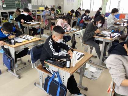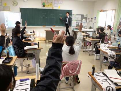 毎年12月になると、1月に行う「書初め大会」に向けて、地域の書道の先生をお招きして、書写指導を受けています。今年度も、各クラス2回ずつご指導をいただきます。