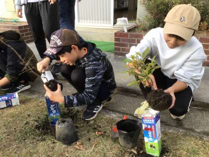 12/13は、古くなったポット(牛乳パック)から、新しいポットに替えました。あんなに小さかったどんぐりの芽が、6年児童の膝のあたりまで大きくなっていました。