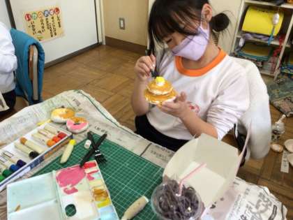 1年生の図工では、「ごちそうパーティーをはじめよう」という単元を学習しています。12/20の学習では、事前に紙粘土で作っておいたお寿司、ハンバーガー、ピザ、パフェなどに、絵の具で色を付けました。出来上がった作品を机の上に並べると、本当にごちそうパーティーが始まりそうでした。
