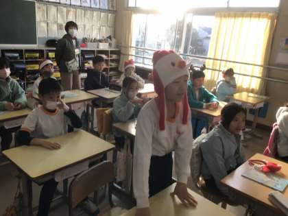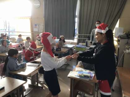 伊保小学校には1週間に一度、ALTの先生が来てくださいます。12/19の4年生の授業では、ALTと児童がサンタコスチュームを着て、歌ったり踊ったりしました。また、クリスマスクイズを楽しみました。