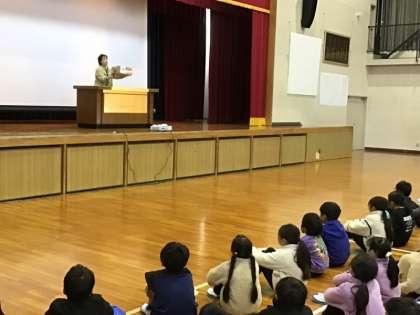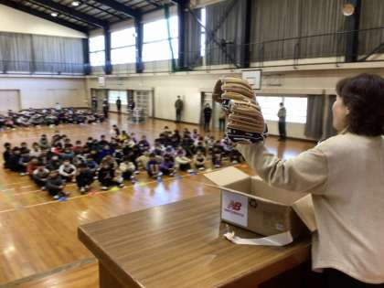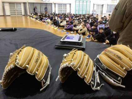 1/16は臨時集会を開き、大谷選手からの手紙とグローブ3つが披露されました。児童からは、大きな喜びの声が聞こえました。これから児童が順番に使って、大谷選手の「野球やろうぜ!」に応えていきます。
