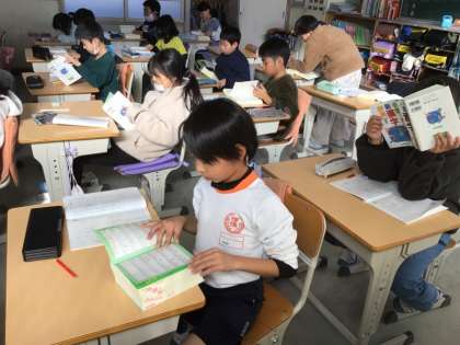 3年生の国語では、漢和辞典の使い方を勉強しています。1/19の授業では、「湯」「場」「波」「体」「目」「音」「氷」などの音読みと訓読みを、漢和辞典で調べました。