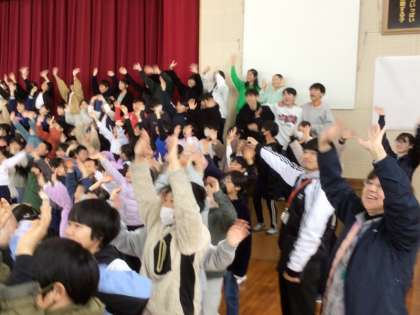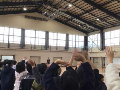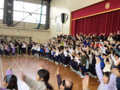 全校児童が体育館に集合し、12月の学年発表会で披露したように、全校児童で校歌を歌いました。1回目は校歌を高らかに歌い、きれいな歌声を録音しました。2回目は体育館内にドローンを飛ばし、児童が歌っている様子を撮影しました。児童は歌いながら頭上のドローンに向かって、大きく手を振っていました。
