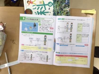 6年生の理科では、「てこのはたらき」を学習しています。2/2の授業では、ランドセルと棒を使って、力点、支点、作用点について学習していました。