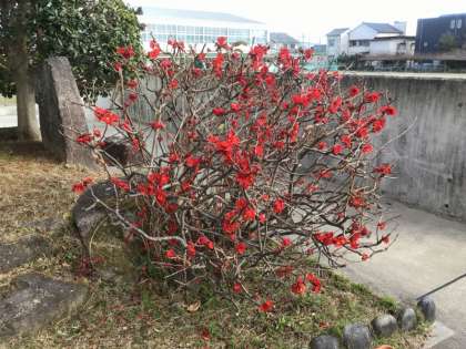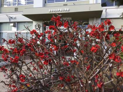 伊保小学校来賓玄関前に、木瓜(ぼけ)の木があります。暖かい日が多くなってきて、鮮やかな木瓜の花が咲き始めました。卒業に向かう6年生を、祝福しているようです。