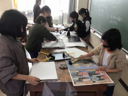 3/7の学習では、彫り終わった児童がインクを付け、摺りあげに入りました。バレンで丁寧にこすると、木版画の風合いがよくでた作品が出来上がりました。